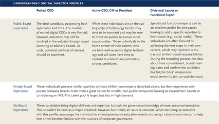Answering each of these questions will allow boards to focus their search on those candidates that will be most in line with the company’s immediate needs and long-term strategy. The chart to the right outlines a diverse set of digital director profiles, each with its own distinct characteristics.
