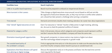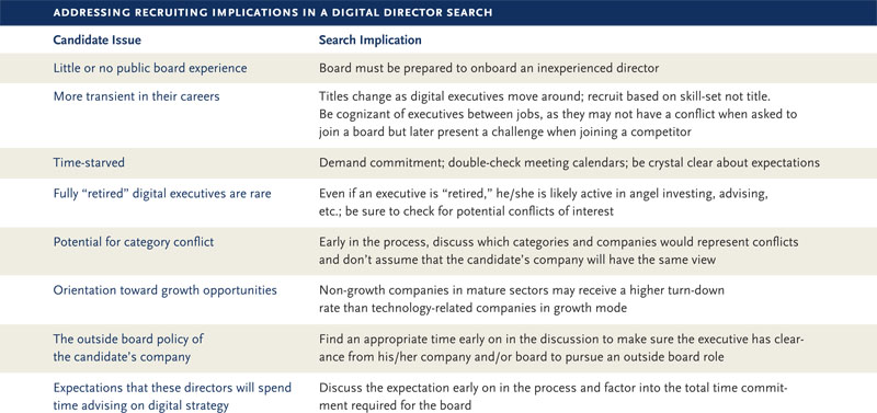 Recruiting board directors from the digital, consumer Internet or technology fields may mean compromising on conventional benchmarks, such as prior board experience or international expertise, in favor of more contemporary skill-sets, for example, experience with social media platforms or digital advertising. Additionally, boards should understand that directors with digital expertise may not have achieved the same stature as candidates from more traditional fields; many of these candidates have not reached the C-level, for example. These young, ambitious and, oftentimes, time-starved executives can be more transient than more established executives, and they may be less familiar with the customs of a corporate boardroom.